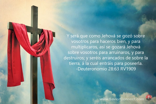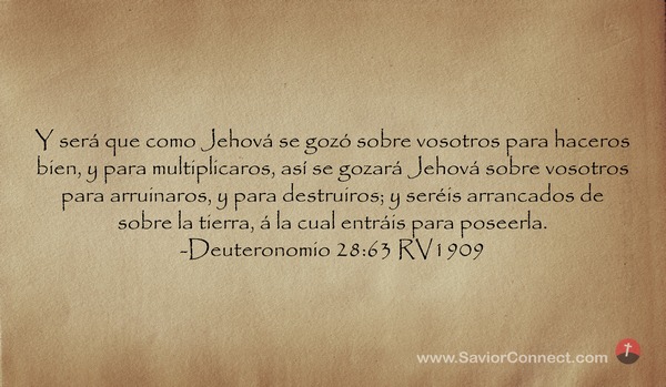 Y será que como Jehová se gozó sobre vosotros para haceros bien, y para multiplicaros, así se gozará Jehová sobre vosotros para arruinaros, y para destruiros; y seréis arrancados de sobre la tierra, á la cual entráis para poseerla. -Deuteronomio 28:63 RV1909
