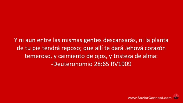Y ni aun entre las mismas gentes descansarás, ni la planta de tu pie tendrá reposo; que allí te dará Jehová corazón temeroso, y caimiento de ojos, y tristeza de alma: -Deuteronomio 28:65 RV1909