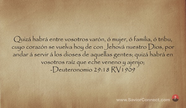 Quizá habrá entre vosotros varón, ó mujer, ó familia, ó tribu, cuyo corazón se vuelva hoy de con Jehová nuestro Dios, por andar á servir á los dioses de aquellas gentes; quizá habrá en vosotros raíz que eche veneno y ajenjo; -Deuteronomio 29:18 RV1909