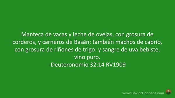 Manteca de vacas y leche de ovejas, con grosura de corderos, y carneros de Basán; también machos de cabrío, con grosura de riñones de trigo: y sangre de uva bebiste, vino puro. -Deuteronomio 32:14 RV1909