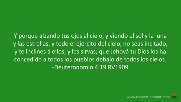 Y porque alzando tus ojos al cielo, y viendo el sol y la luna y las estrellas, y todo el ejército del cielo, no seas incitado, y te inclines á ellos, y les sirvas; que Jehová tu Dios los ha concedido á todos los pueblos debajo de todos los cielos. -Deuteronomio 4:19 RV1909