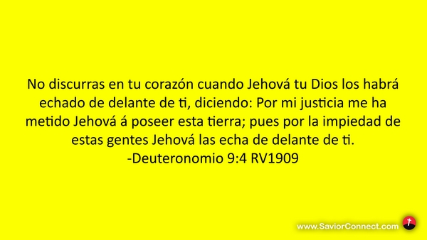 No discurras en tu corazón cuando Jehová tu Dios los habrá echado de delante de ti, diciendo: Por mi justicia me ha metido Jehová á poseer esta tierra; pues por la impiedad de estas gentes Jehová las echa de delante de ti. -Deuteronomio 9:4 RV1909
