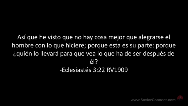 Así que he visto que no hay cosa mejor que alegrarse el hombre con lo que hiciere; porque esta es su parte: porque ¿quién lo llevará para que vea lo que ha de ser después de él? -Eclesiastés 3:22 RV1909
