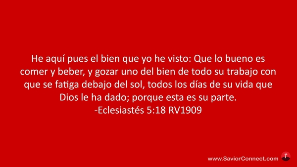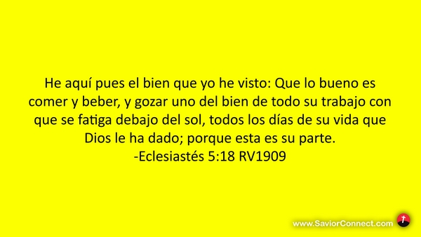 He aquí pues el bien que yo he visto: Que lo bueno es comer y beber, y gozar uno del bien de todo su trabajo con que se fatiga debajo del sol, todos los días de su vida que Dios le ha dado; porque esta es su parte. -Eclesiastés 5:18 RV1909