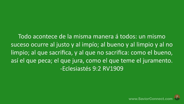 Todo acontece de la misma manera á todos: un mismo suceso ocurre al justo y al impío; al bueno y al limpio y al no limpio; al que sacrifica, y al que no sacrifica: como el bueno, así el que peca; el que jura, como el que teme el juramento. -Eclesiastés 9:2 RV1909