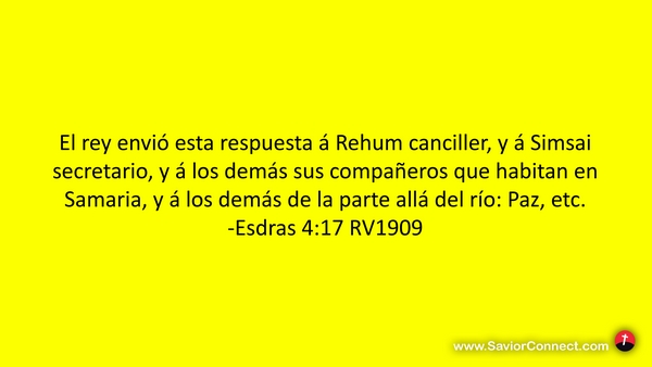 El rey envió esta respuesta á Rehum canciller, y á Simsai secretario, y á los demás sus compañeros que habitan en Samaria, y á los demás de la parte allá del río: Paz, etc. -Esdras 4:17 RV1909