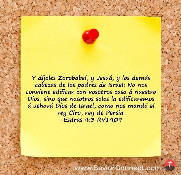 Y díjoles Zorobabel, y Jesuá, y los demás cabezas de los padres de Israel: No nos conviene edificar con vosotros casa á nuestro Dios, sino que nosotros solos la edificaremos á Jehová Dios de Israel, como nos mandó el rey Ciro, rey de Persia. -Esdras 4:3 RV1909