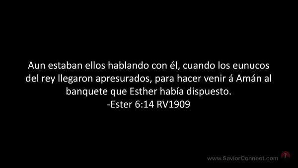 Aun estaban ellos hablando con él, cuando los eunucos del rey llegaron apresurados, para hacer venir á Amán al banquete que Esther había dispuesto. -Ester 6:14 RV1909