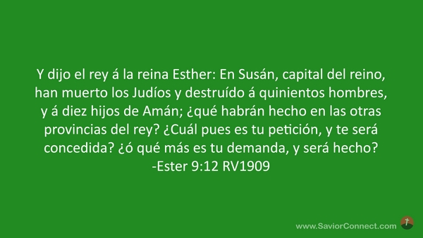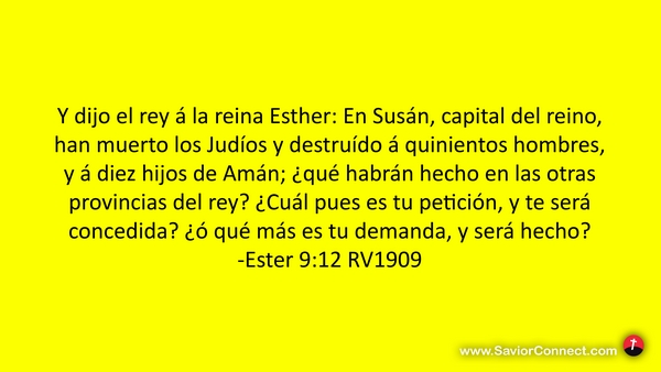 Y dijo el rey á la reina Esther: En Susán, capital del reino, han muerto los Judíos y destruído á quinientos hombres, y á diez hijos de Amán; ¿qué habrán hecho en las otras provincias del rey? ¿Cuál pues es tu petición, y te será concedida? ¿ó qué más es tu demanda, y será hecho? -Ester 9:12 RV1909