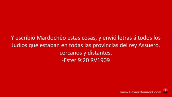 Y escribió Mardochêo estas cosas, y envió letras á todos los Judíos que estaban en todas las provincias del rey Assuero, cercanos y distantes, -Ester 9:20 RV1909