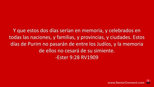 Y que estos dos días serían en memoria, y celebrados en todas las naciones, y familias, y provincias, y ciudades. Estos días de Purim no pasarán de entre los Judíos, y la memoria de ellos no cesará de su simiente. -Ester 9:28 RV1909