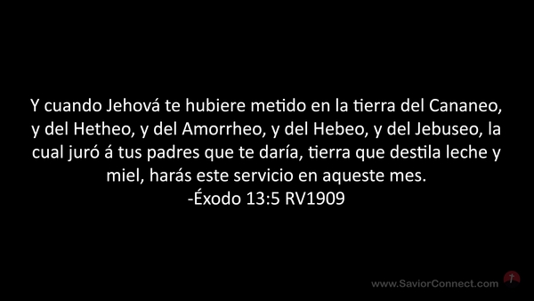 Y cuando Jehová te hubiere metido en la tierra del Cananeo, y del Hetheo, y del Amorrheo, y del Hebeo, y del Jebuseo, la cual juró á tus padres que te daría, tierra que destila leche y miel, harás este servicio en aqueste mes. -Éxodo 13:5 RV1909