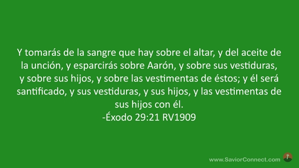 Y tomarás de la sangre que hay sobre el altar, y del aceite de la unción, y esparcirás sobre Aarón, y sobre sus vestiduras, y sobre sus hijos, y sobre las vestimentas de éstos; y él será santificado, y sus vestiduras, y sus hijos, y las vestimentas de sus hijos con él. -Éxodo 29:21 RV1909
