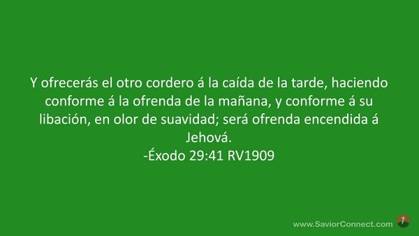 Y ofrecerás el otro cordero á la caída de la tarde, haciendo conforme á la ofrenda de la mañana, y conforme á su libación, en olor de suavidad; será ofrenda encendida á Jehová. -Éxodo 29:41 RV1909