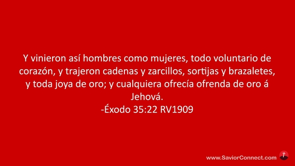 Y vinieron así hombres como mujeres, todo voluntario de corazón, y trajeron cadenas y zarcillos, sortijas y brazaletes, y toda joya de oro; y cualquiera ofrecía ofrenda de oro á Jehová. -Éxodo 35:22 RV1909