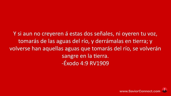 Y si aun no creyeren á estas dos señales, ni oyeren tu voz, tomarás de las aguas del río, y derrámalas en tierra; y volverse han aquellas aguas que tomarás del río, se volverán sangre en la tierra. -Éxodo 4:9 RV1909