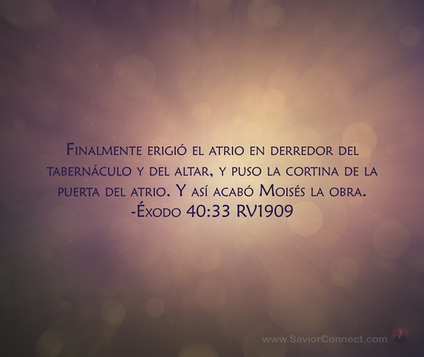Finalmente erigió el atrio en derredor del tabernáculo y del altar, y puso la cortina de la puerta del atrio. Y así acabó Moisés la obra. -Éxodo 40:33 RV1909