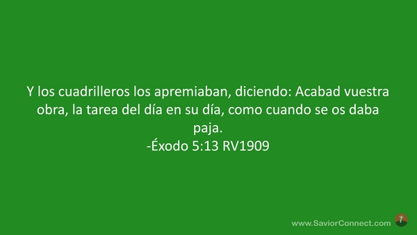 Y los cuadrilleros los apremiaban, diciendo: Acabad vuestra obra, la tarea del día en su día, como cuando se os daba paja. -Éxodo 5:13 RV1909