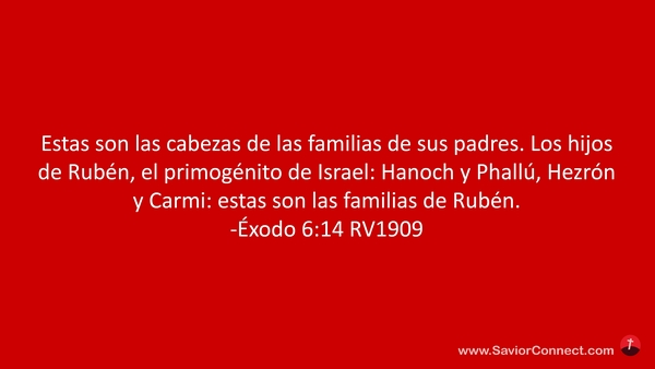 Estas son las cabezas de las familias de sus padres. Los hijos de Rubén, el primogénito de Israel: Hanoch y Phallú, Hezrón y Carmi: estas son las familias de Rubén. -Éxodo 6:14 RV1909