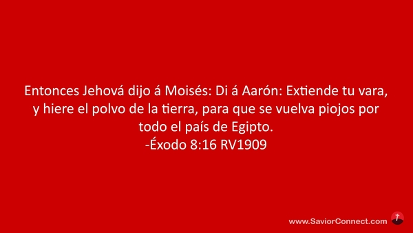 Entonces Jehová dijo á Moisés: Di á Aarón: Extiende tu vara, y hiere el polvo de la tierra, para que se vuelva piojos por todo el país de Egipto. -Éxodo 8:16 RV1909
