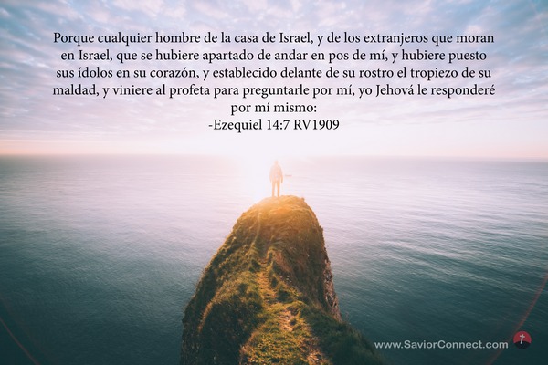 Porque cualquier hombre de la casa de Israel, y de los extranjeros que moran en Israel, que se hubiere apartado de andar en pos de mí, y hubiere puesto sus ídolos en su corazón, y establecido delante de su rostro el tropiezo de su maldad, y viniere al profeta para preguntarle por mí, yo Jehová le responderé por mí mismo: -Ezequiel 14:7 RV1909