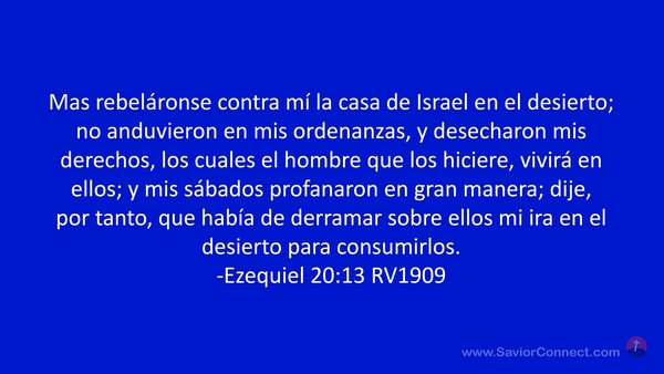 Mas rebeláronse contra mí la casa de Israel en el desierto; no anduvieron en mis ordenanzas, y desecharon mis derechos, los cuales el hombre que los hiciere, vivirá en ellos; y mis sábados profanaron en gran manera; dije, por tanto, que había de derramar sobre ellos mi ira en el desierto para consumirlos. -Ezequiel 20:13 RV1909