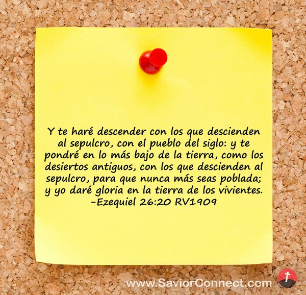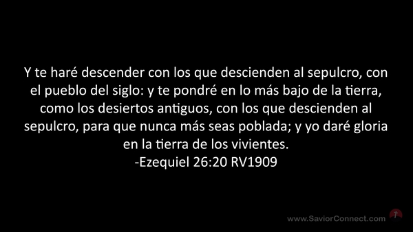 Y te haré descender con los que descienden al sepulcro, con el pueblo del siglo: y te pondré en lo más bajo de la tierra, como los desiertos antiguos, con los que descienden al sepulcro, para que nunca más seas poblada; y yo daré gloria en la tierra de los vivientes. -Ezequiel 26:20 RV1909