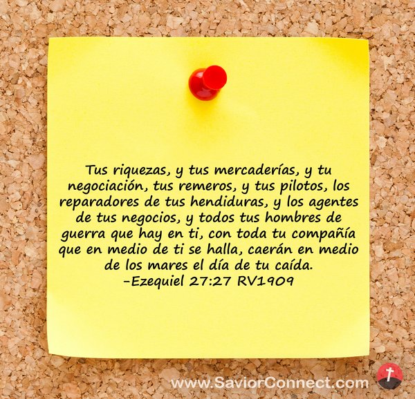 Tus riquezas, y tus mercaderías, y tu negociación, tus remeros, y tus pilotos, los reparadores de tus hendiduras, y los agentes de tus negocios, y todos tus hombres de guerra que hay en ti, con toda tu compañía que en medio de ti se halla, caerán en medio de los mares el día de tu caída. -Ezequiel 27:27 RV1909