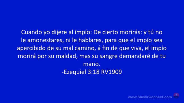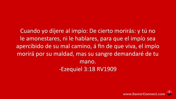 Cuando yo dijere al impío: De cierto morirás: y tú no le amonestares, ni le hablares, para que el impío sea apercibido de su mal camino, á fin de que viva, el impío morirá por su maldad, mas su sangre demandaré de tu mano. -Ezequiel 3:18 RV1909