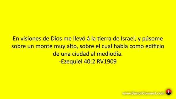 En visiones de Dios me llevó á la tierra de Israel, y púsome sobre un monte muy alto, sobre el cual había como edificio de una ciudad al mediodía. -Ezequiel 40:2 RV1909