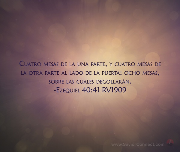 Cuatro mesas de la una parte, y cuatro mesas de la otra parte al lado de la puerta; ocho mesas, sobre las cuales degollarán. -Ezequiel 40:41 RV1909