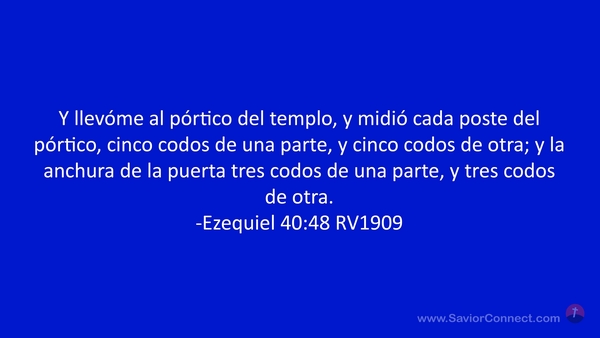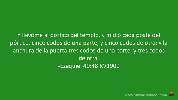 Y llevóme al pórtico del templo, y midió cada poste del pórtico, cinco codos de una parte, y cinco codos de otra; y la anchura de la puerta tres codos de una parte, y tres codos de otra. -Ezequiel 40:48 RV1909