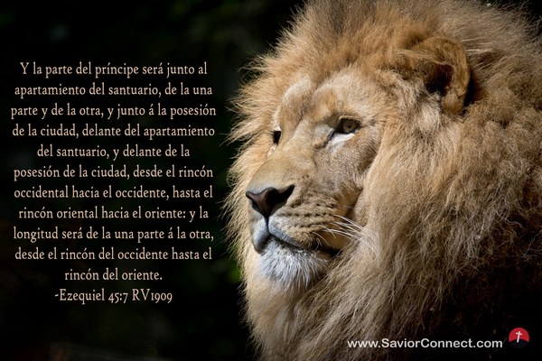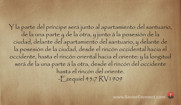 Y la parte del príncipe será junto al apartamiento del santuario, de la una parte y de la otra, y junto á la posesión de la ciudad, delante del apartamiento del santuario, y delante de la posesión de la ciudad, desde el rincón occidental hacia el occidente, hasta el rincón oriental hacia el oriente: y la longitud será de la una parte á la otra, desde el rincón del occidente hasta el rincón del oriente. -Ezequiel 45:7 RV1909