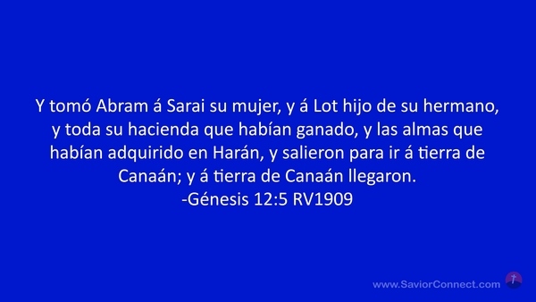 Y tomó Abram á Sarai su mujer, y á Lot hijo de su hermano, y toda su hacienda que habían ganado, y las almas que habían adquirido en Harán, y salieron para ir á tierra de Canaán; y á tierra de Canaán llegaron. -Génesis 12:5 RV1909