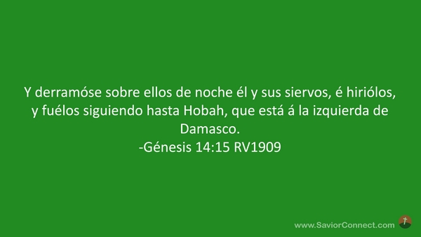 Y derramóse sobre ellos de noche él y sus siervos, é hiriólos, y fuélos siguiendo hasta Hobah, que está á la izquierda de Damasco. -Génesis 14:15 RV1909
