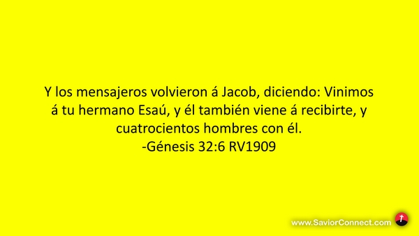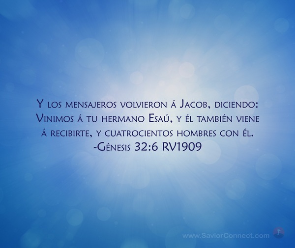 Y los mensajeros volvieron á Jacob, diciendo: Vinimos á tu hermano Esaú, y él también viene á recibirte, y cuatrocientos hombres con él. -Génesis 32:6 RV1909
