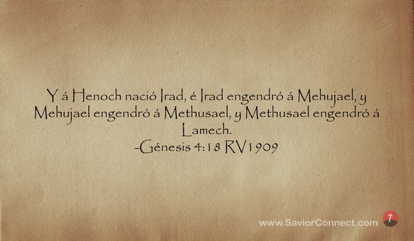 Y á Henoch nació Irad, é Irad engendró á Mehujael, y Mehujael engendró á Methusael, y Methusael engendró á Lamech. -Génesis 4:18 RV1909