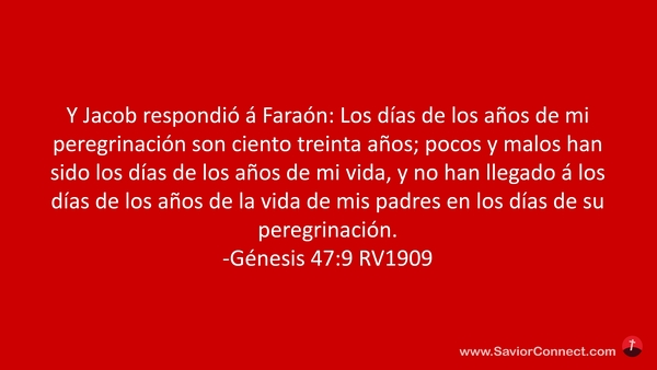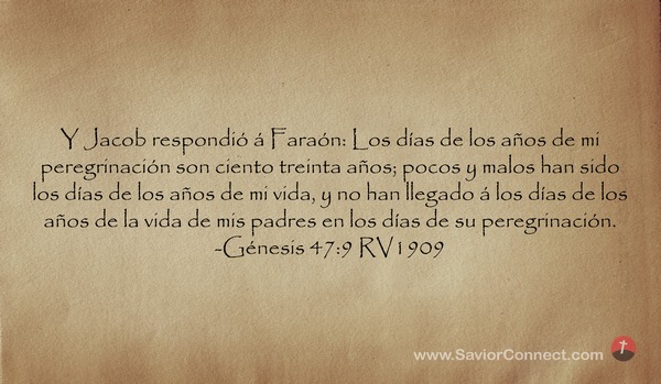 Y Jacob respondió á Faraón: Los días de los años de mi peregrinación son ciento treinta años; pocos y malos han sido los días de los años de mi vida, y no han llegado á los días de los años de la vida de mis padres en los días de su peregrinación. -Génesis 47:9 RV1909