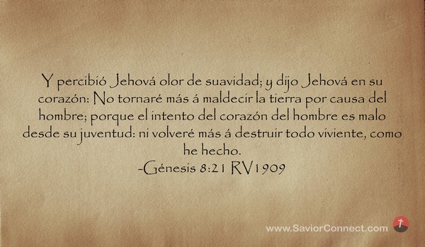 Y percibió Jehová olor de suavidad; y dijo Jehová en su corazón: No tornaré más á maldecir la tierra por causa del hombre; porque el intento del corazón del hombre es malo desde su juventud: ni volveré más á destruir todo viviente, como he hecho. -Génesis 8:21 RV1909