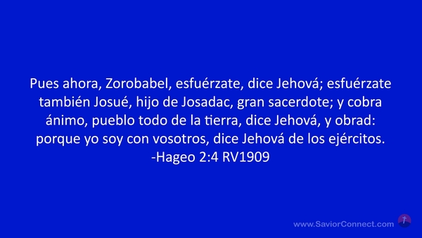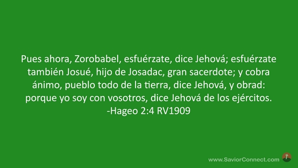 Pues ahora, Zorobabel, esfuérzate, dice Jehová; esfuérzate también Josué, hijo de Josadac, gran sacerdote; y cobra ánimo, pueblo todo de la tierra, dice Jehová, y obrad: porque yo soy con vosotros, dice Jehová de los ejércitos. -Hageo 2:4 RV1909