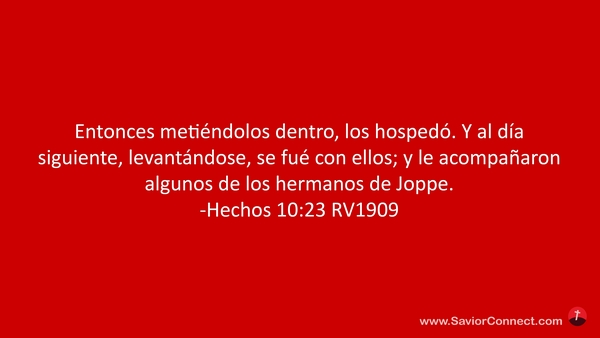 Entonces metiéndolos dentro, los hospedó. Y al día siguiente, levantándose, se fué con ellos; y le acompañaron algunos de los hermanos de Joppe. -Hechos 10:23 RV1909