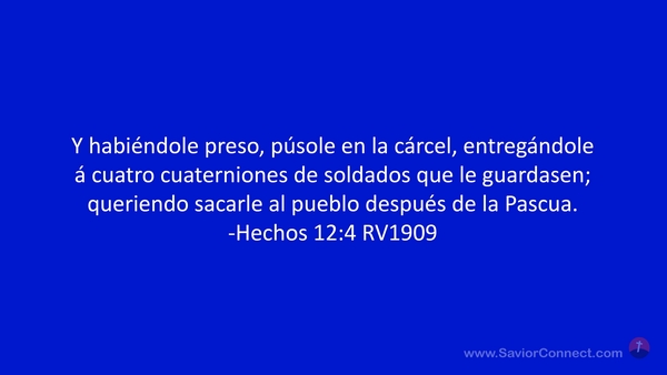 Y habiéndole preso, púsole en la cárcel, entregándole á cuatro cuaterniones de soldados que le guardasen; queriendo sacarle al pueblo después de la Pascua. -Hechos 12:4 RV1909
