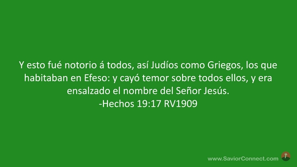 Y esto fué notorio á todos, así Judíos como Griegos, los que habitaban en Efeso: y cayó temor sobre todos ellos, y era ensalzado el nombre del Señor Jesús. -Hechos 19:17 RV1909