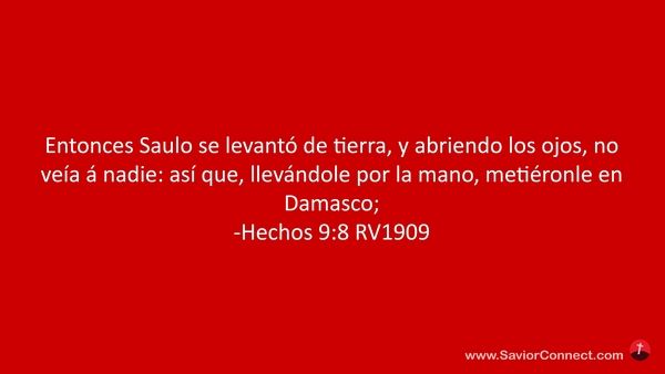 Entonces Saulo se levantó de tierra, y abriendo los ojos, no veía á nadie: así que, llevándole por la mano, metiéronle en Damasco; -Hechos 9:8 RV1909