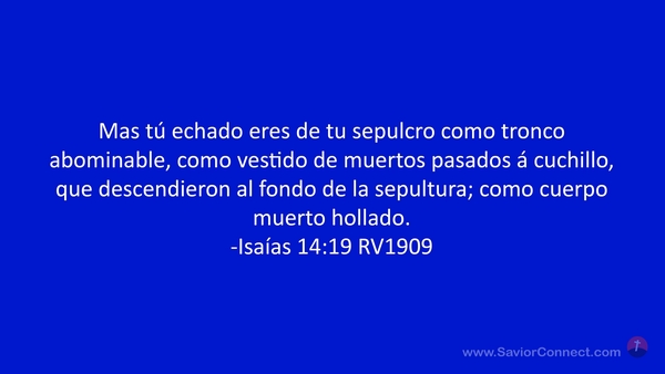 Mas tú echado eres de tu sepulcro como tronco abominable, como vestido de muertos pasados á cuchillo, que descendieron al fondo de la sepultura; como cuerpo muerto hollado. -Isaías 14:19 RV1909