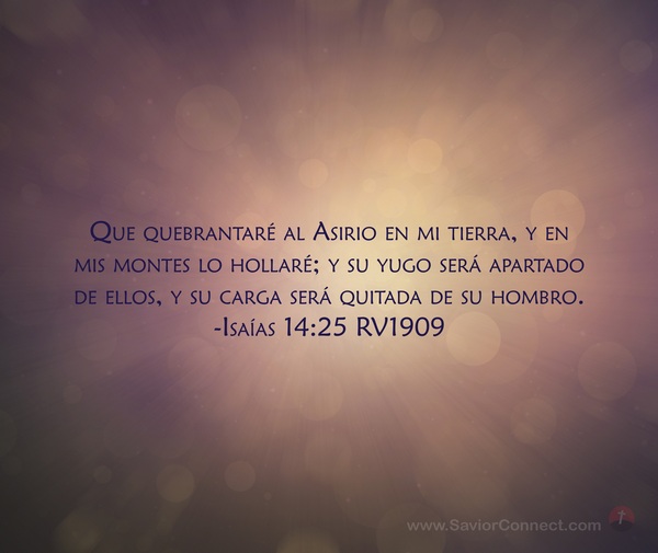 Que quebrantaré al Asirio en mi tierra, y en mis montes lo hollaré; y su yugo será apartado de ellos, y su carga será quitada de su hombro. -Isaías 14:25 RV1909
