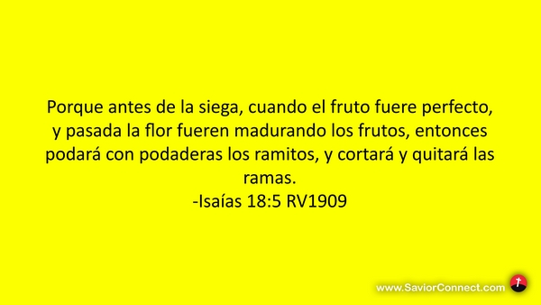 Porque antes de la siega, cuando el fruto fuere perfecto, y pasada la flor fueren madurando los frutos, entonces podará con podaderas los ramitos, y cortará y quitará las ramas. -Isaías 18:5 RV1909