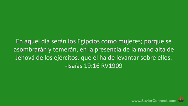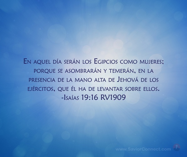 En aquel día serán los Egipcios como mujeres; porque se asombrarán y temerán, en la presencia de la mano alta de Jehová de los ejércitos, que él ha de levantar sobre ellos. -Isaías 19:16 RV1909