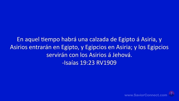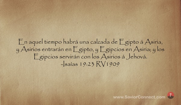 En aquel tiempo habrá una calzada de Egipto á Asiria, y Asirios entrarán en Egipto, y Egipcios en Asiria; y los Egipcios servirán con los Asirios á Jehová. -Isaías 19:23 RV1909