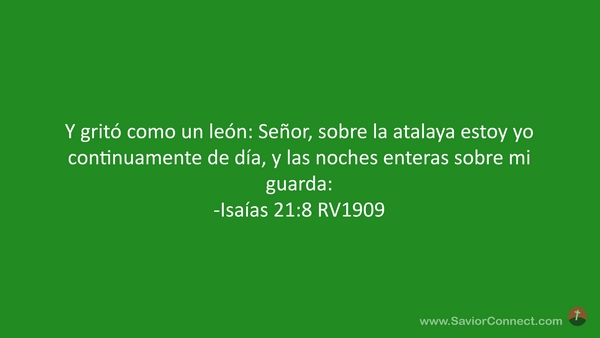 Y gritó como un león: Señor, sobre la atalaya estoy yo continuamente de día, y las noches enteras sobre mi guarda: -Isaías 21:8 RV1909